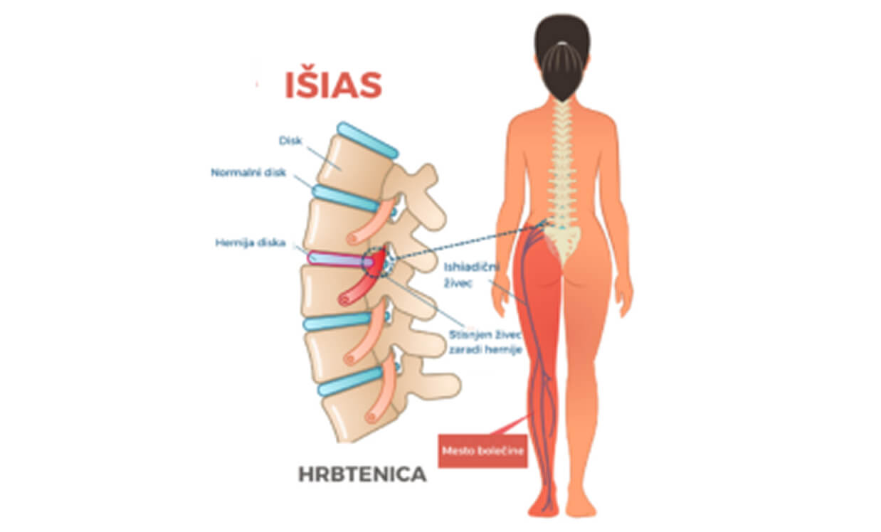 Običajno je, da hernija diska pritisne na bližnji ishiadični živec (položaj L5-S1), kar povzroči bolečino, ki se širi po celotni dolžini noge. Pojav išias tako opisuje simptome, ki potujejo po zadnji strani noge do stopala.
