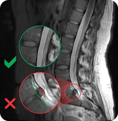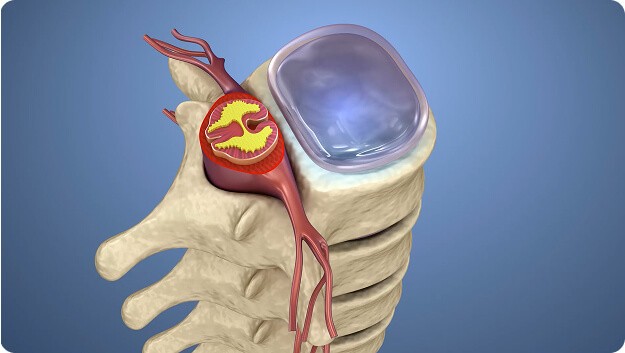 Slika prikazuje razliko med primerno strukturo in pojavom hernija diska.