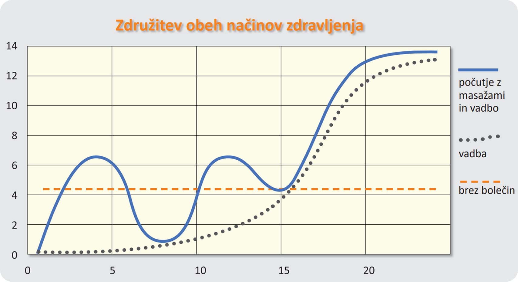 🩵 Graf jasno pokaže: zelena krivulja - kombinacija vadbe in terapevtske masaže dolgoročno vodi v območje brez bolečin.